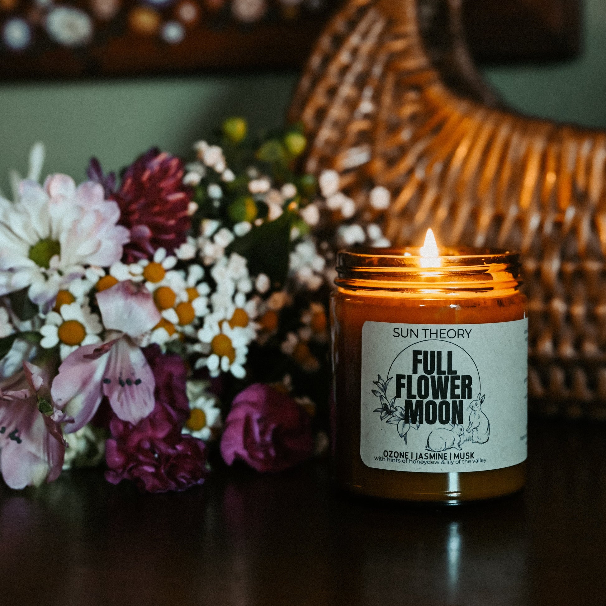 Full Flower Moon wraps the rain, earth, & florals of spring together into a clean & ozonic scent. Refreshing top notes of honeydew & fresh ozone set the stage for a floral heart of jasmine & lily of the valley. Powder and musk balance the woody violet & cedar in the base.